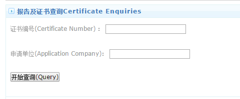 进入以下页面, 在页面中输入证书或报告编号和申请公司即可查询: