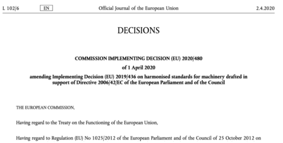 2020年4月2日,欧盟委员会发布了有关机械指令(2006/42/EC)的欧洲统一标准的最新清单。机械制造商可以使用此列表中的标准来证明其机械符合本指令的基本要求。