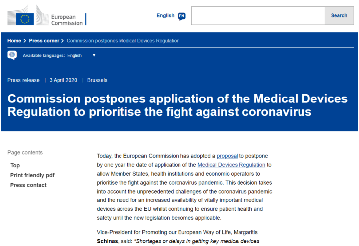 应对指导|欧盟新版MDR推迟一年至2021年5月26日实施,4月3日,欧盟委员会通过了一项提案,将医疗设备条例的实施日期推迟一年,以使成员国、卫生机构和经济经营、者能够优先应对冠状病毒大流行。