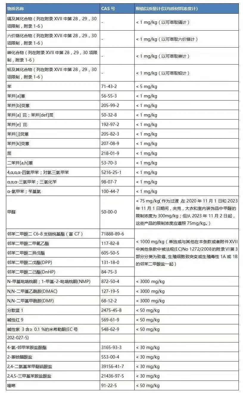 REACH法规附录12列出的受限物质,其限制浓度(以均质材料浓度计)列出如下: